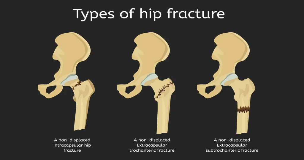 A hip fracture is a break in the hip bone, usually caused by falls or trauma. This type of injury is more common in older individuals who have weakened bones due to conditions like osteoporosis. Hip fractures can cause severe hip pain, difficulty bearing weight on the affected leg, and reduced range of motion. Prompt medical attention is crucial to stabilize the fracture and promote proper healing.